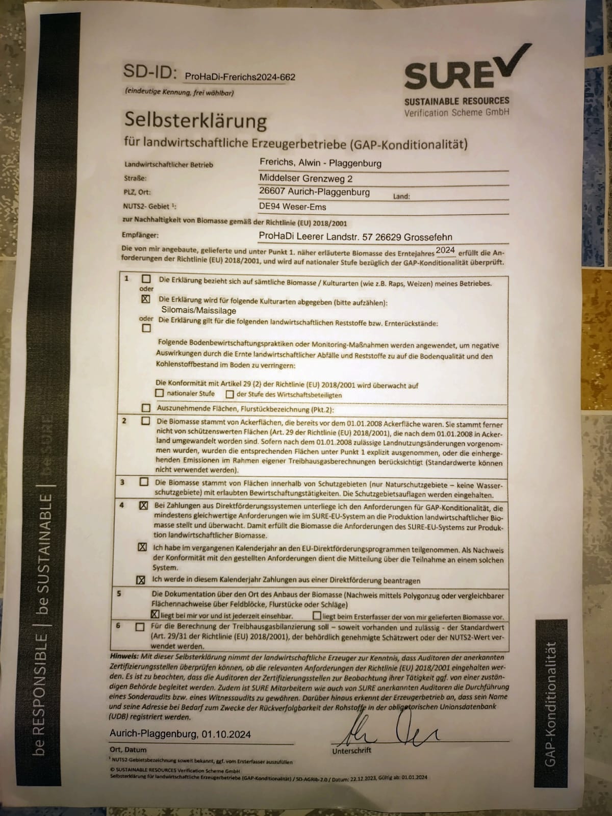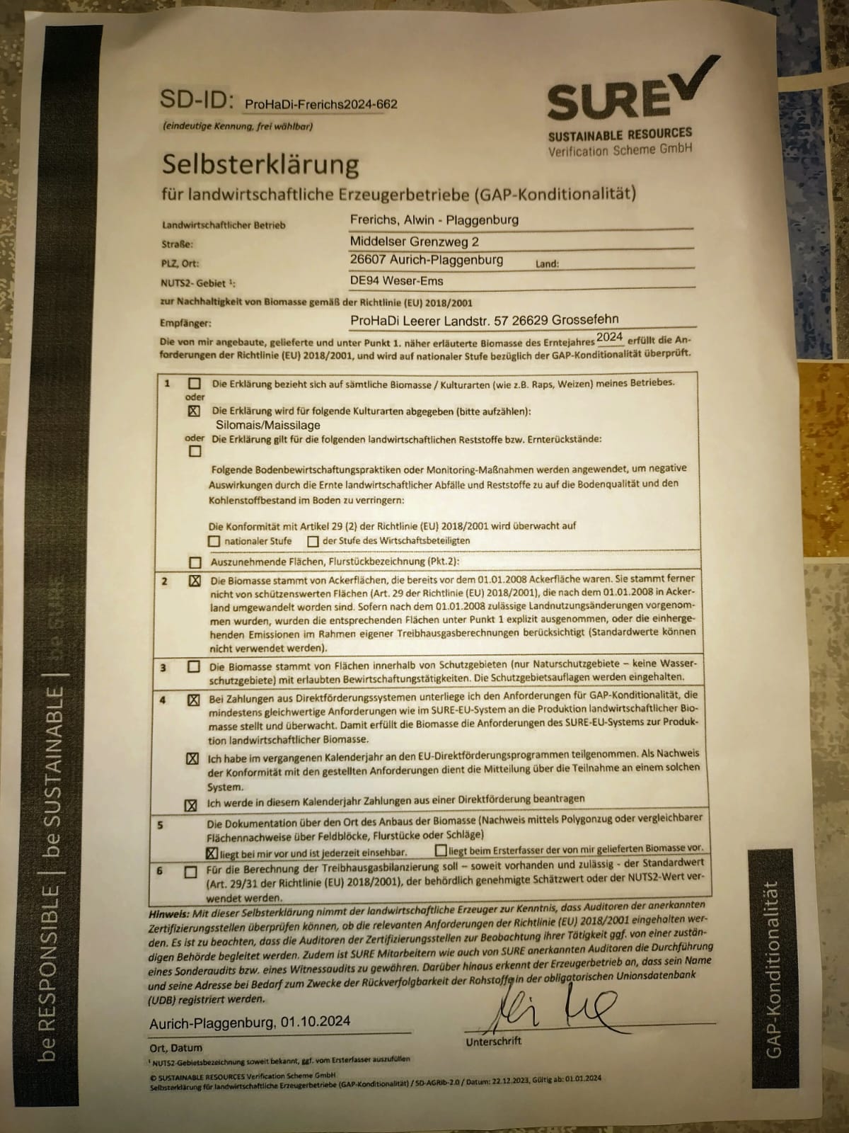 | Gerdes GbR und Gerdes, Waltraud | Klemens | Gerdes | 49696 | Resthausen | 015225882923 | Silomais frisch | Yes | 6.720 | 6.72 ha | 313.80 t | 313.80t | 2024 | Yes | Vertrag | Yes | |||||||||